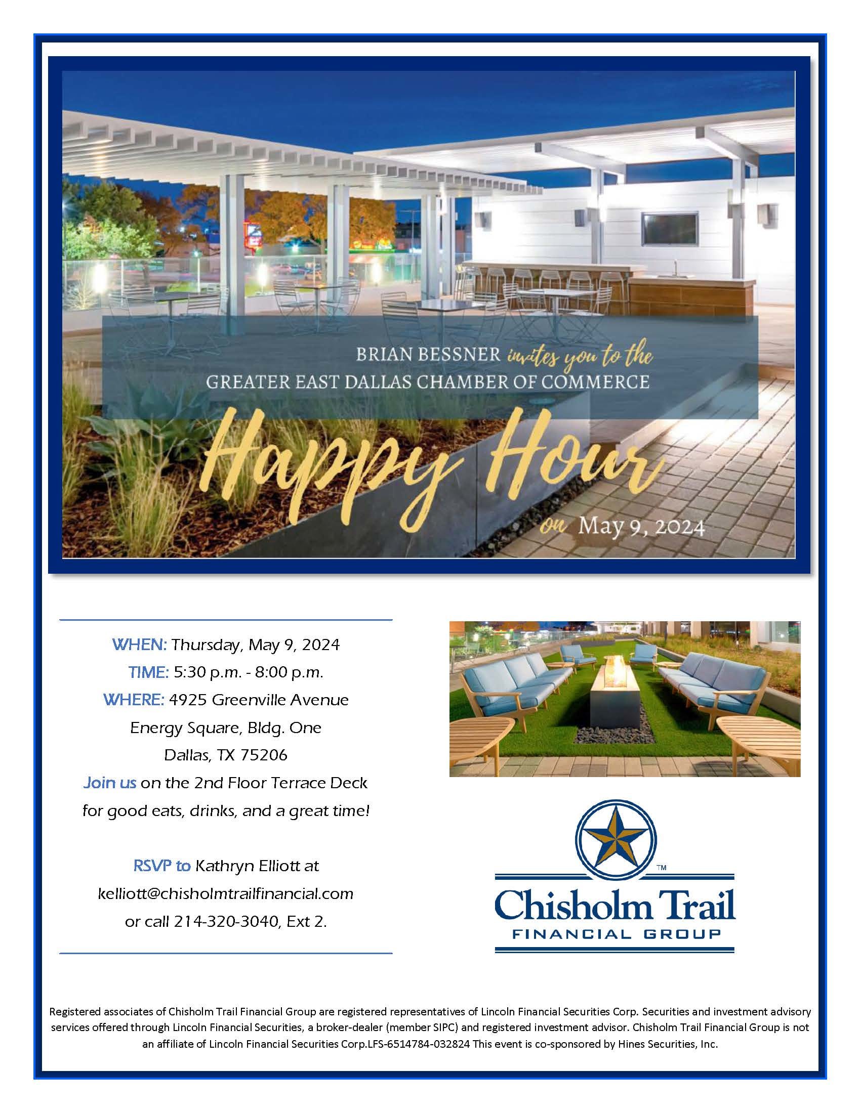 Happy Hour presented by Chisholm Trail Financial Group at 4925 Greenville Avenue at Energy Square, Building One. Join us on the 2nd floor terrace deck for good eats and drinks, and a good time!